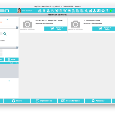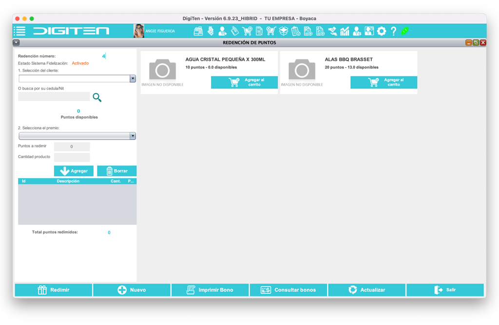 Una vez finalizada la selección de productos, los cuales se acumularán en la tabla izquierda, puedes dar click en el boton Redimir, ubicado en la barra inferior de la ventana,